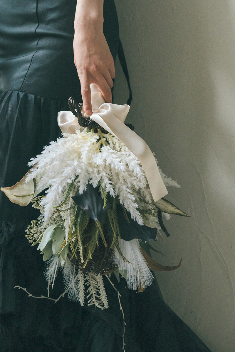 白と黒で落ち着いた色味で大人っぽい雰囲気のブーケ。