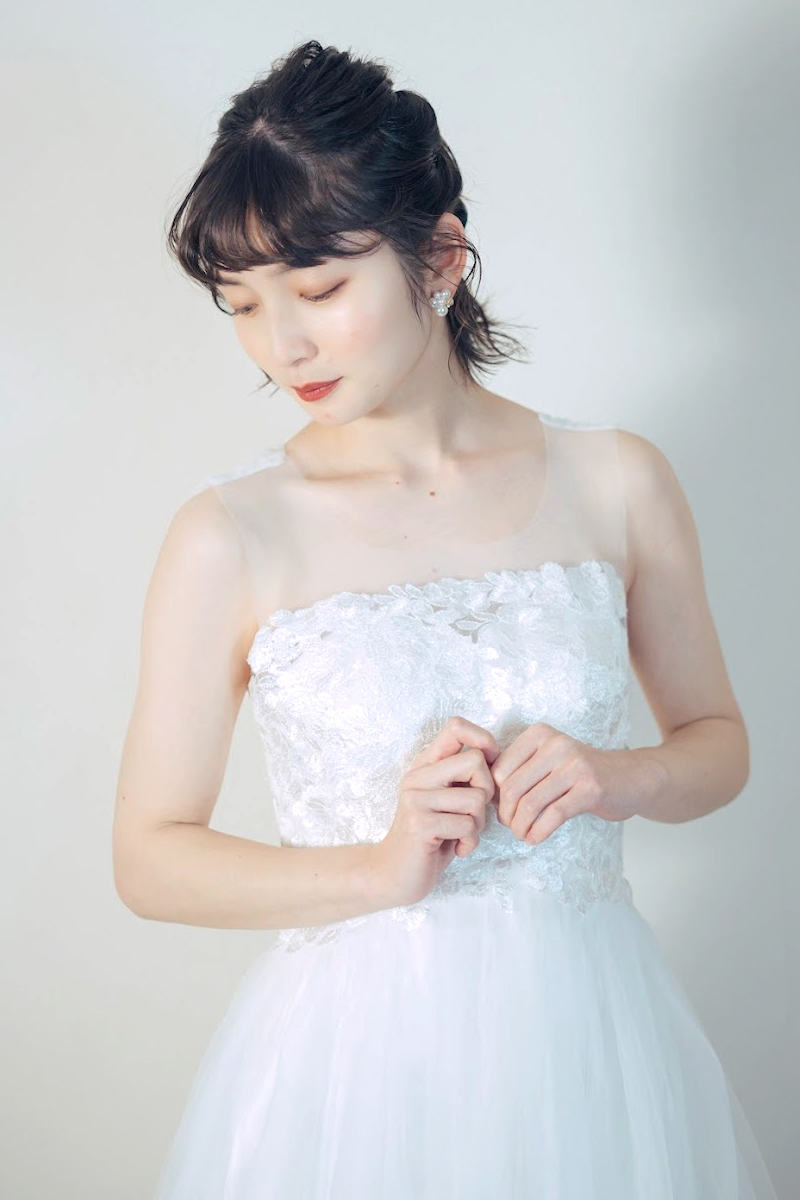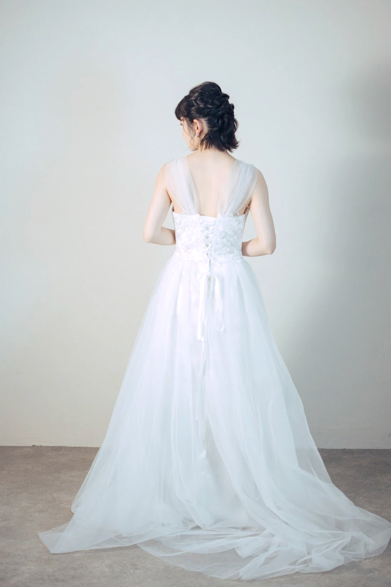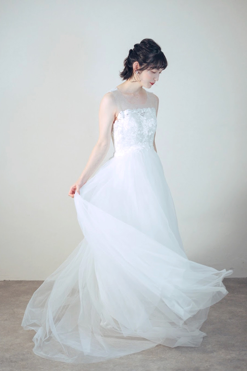 胸元が刺繍デザインのチュールドレス。