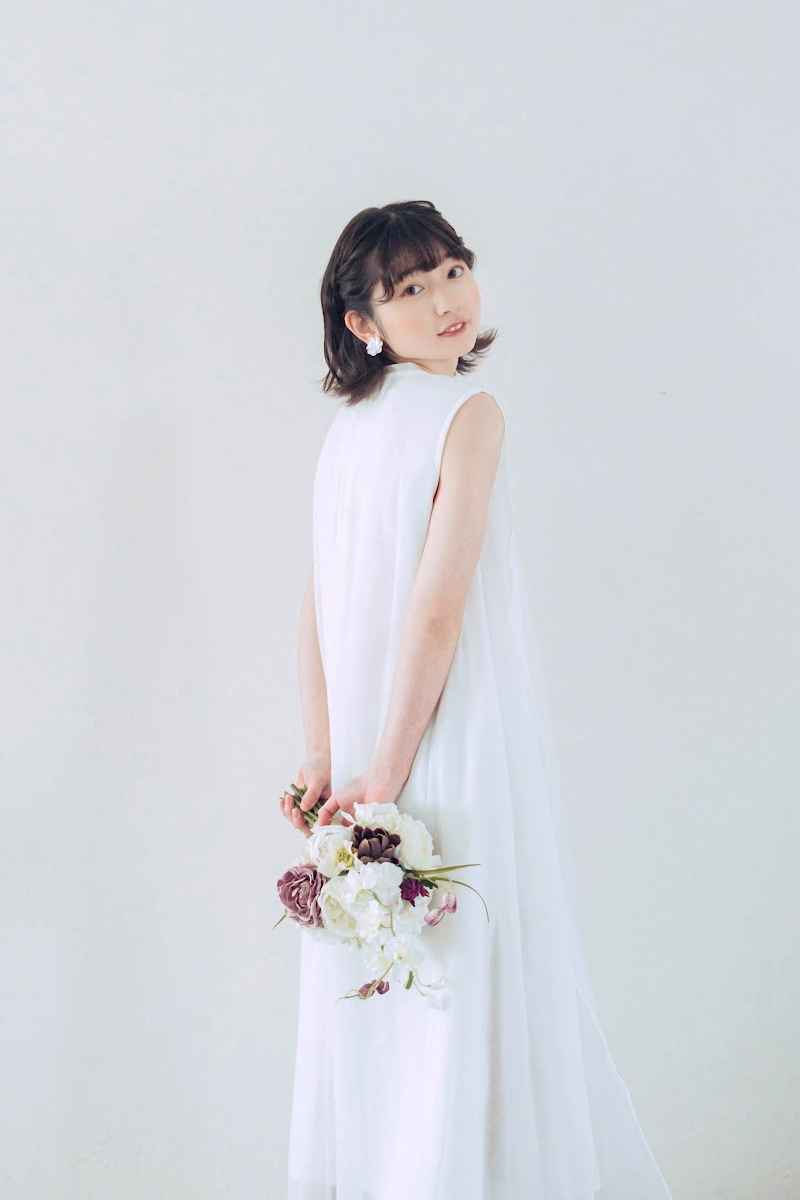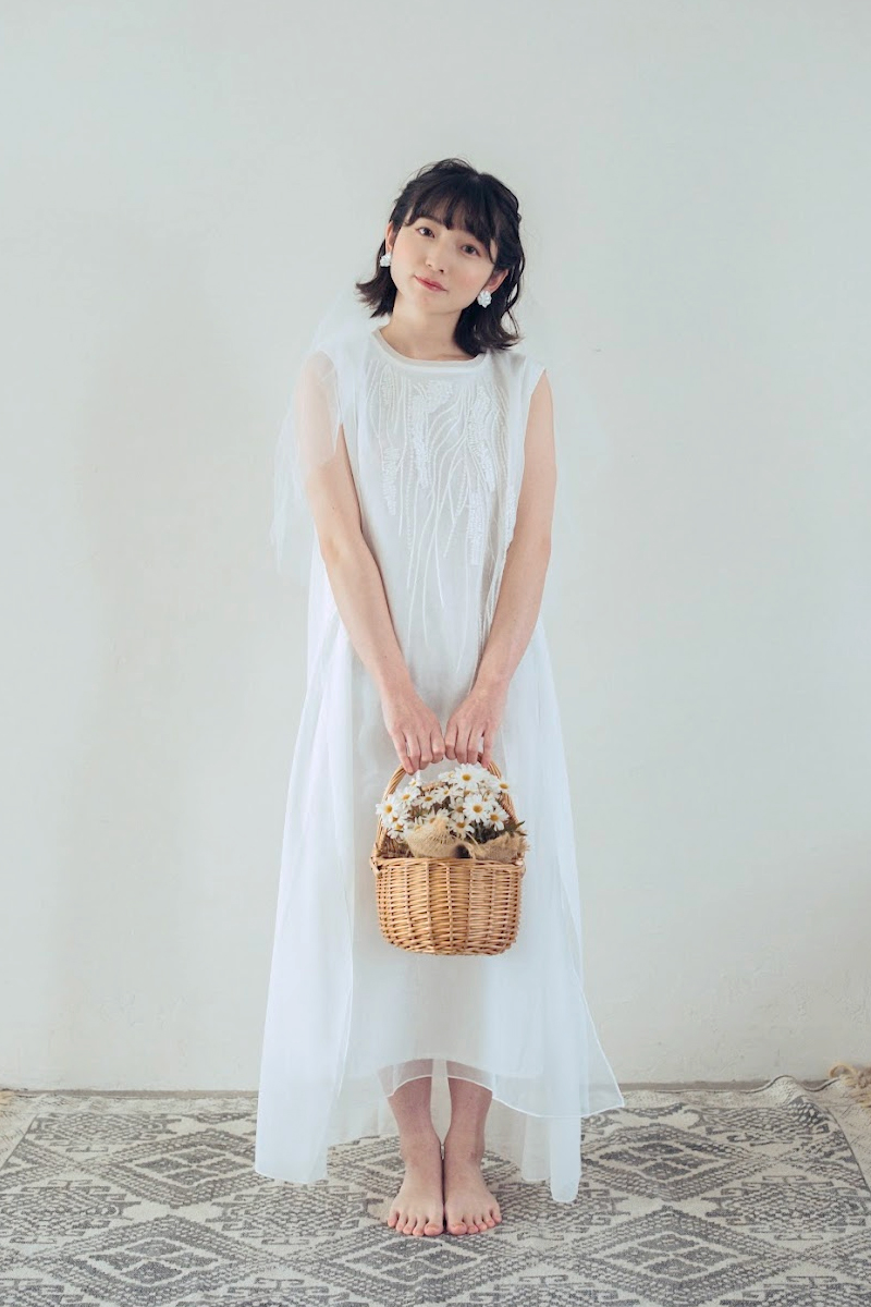 胸元の刺繍がおしゃれなワンピースタイプのカジュアルなドレス。後ろはロングのオーガンジーで、ふんわりと華やかな動きも出ます。