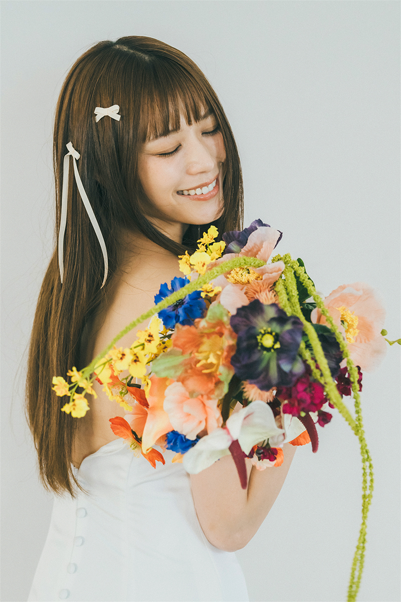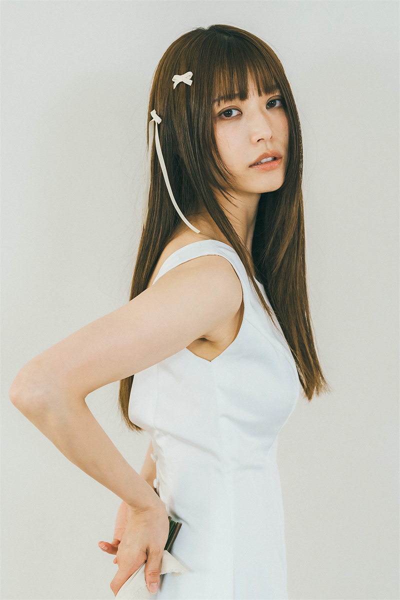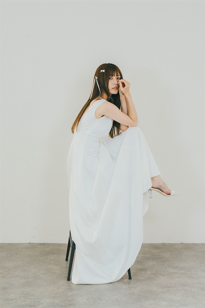 背中は深めのV字に開いたデザインで、クルミボタンをあしらったすっきりとしたバックスタイルが特徴。