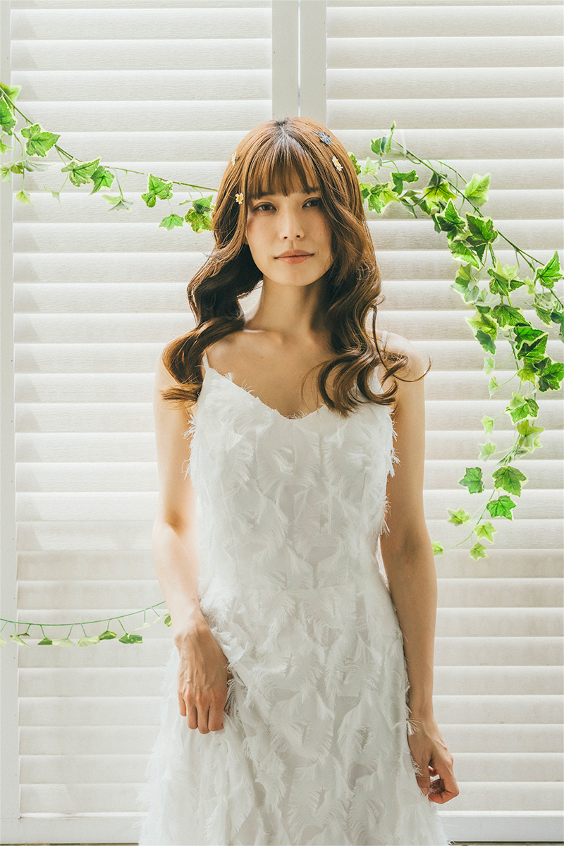 キャミソールタイプのフェザーモチーフドレス。
