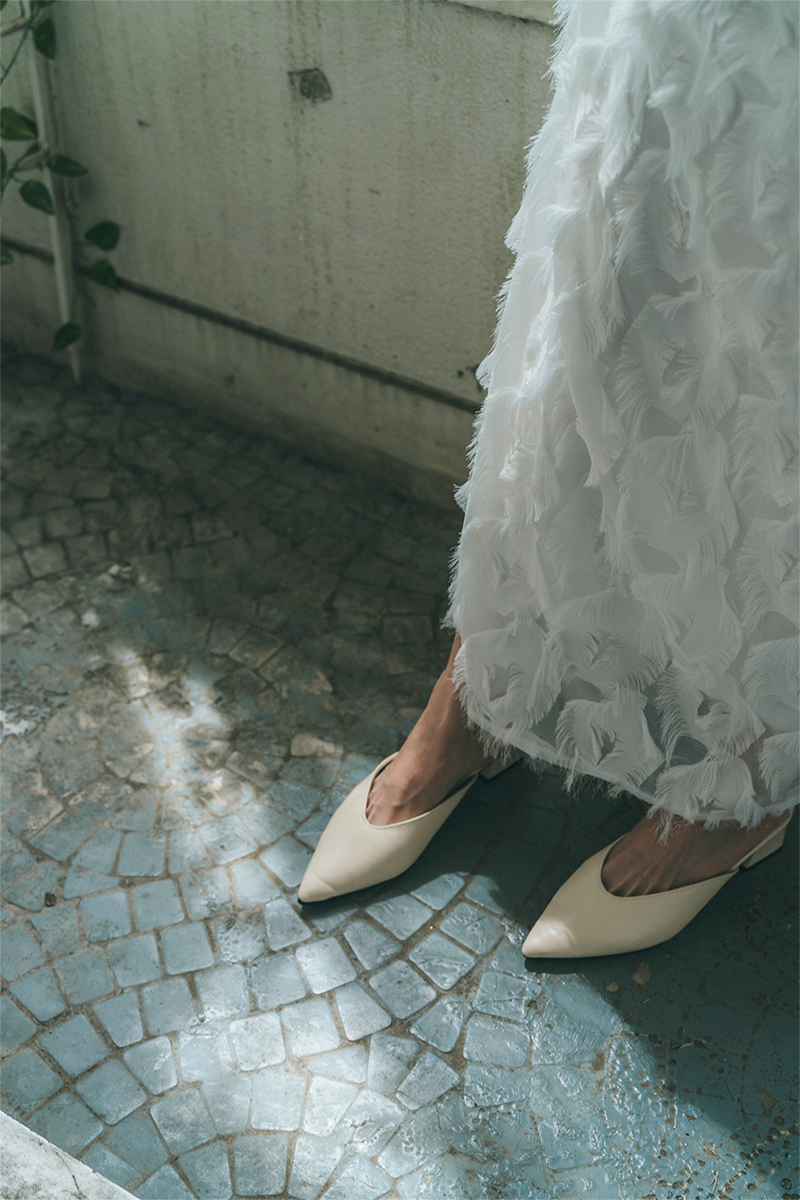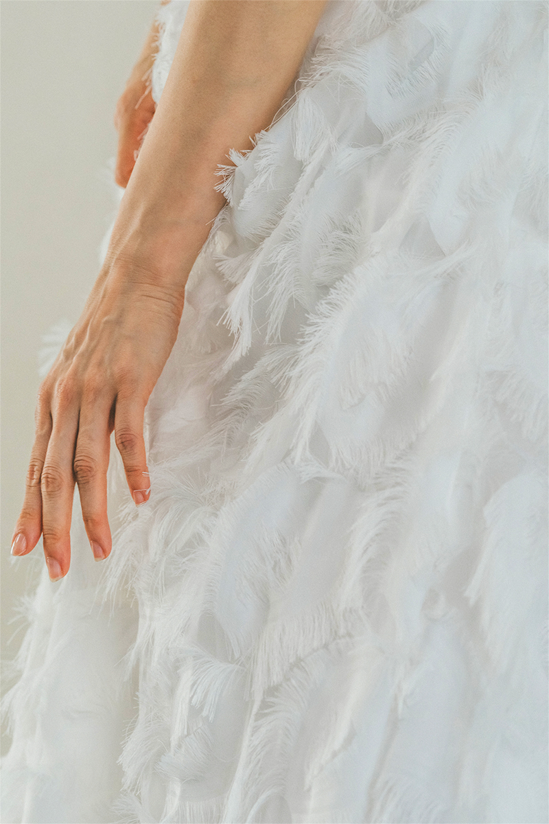 手触りの良いフェザーモチーフの生地が、ふんわりとした雰囲気を演出。