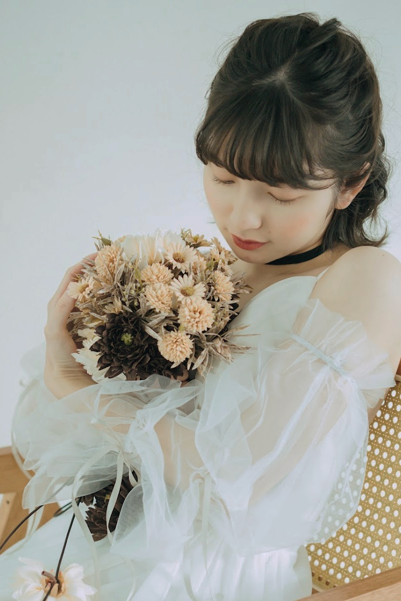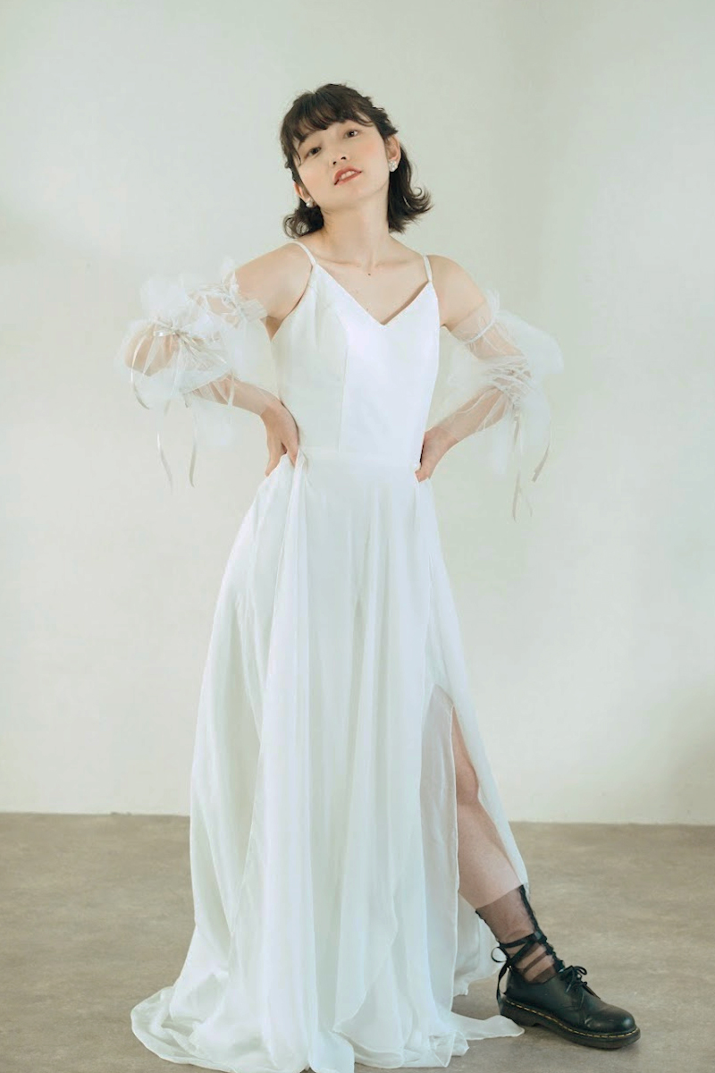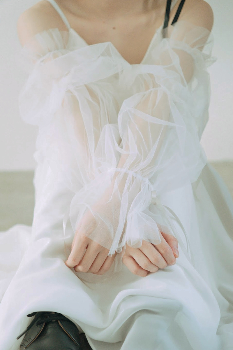 ドレスにプラスしてワンポイントに。細身のグレーのリボンがついた絞りありのデザイン。